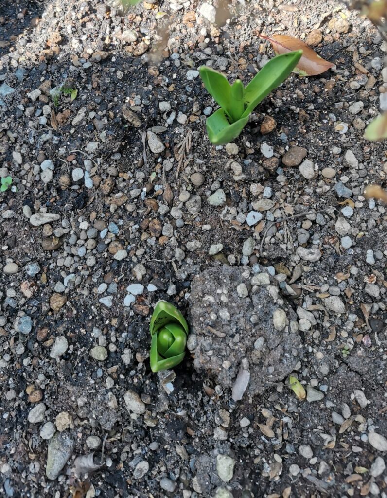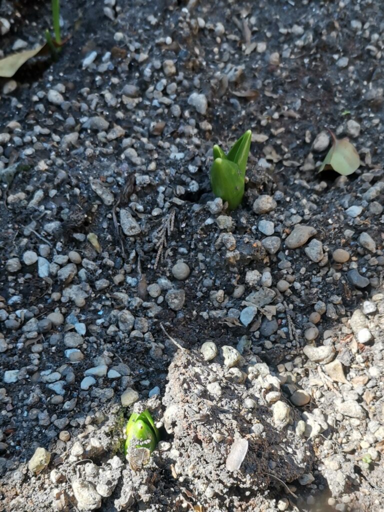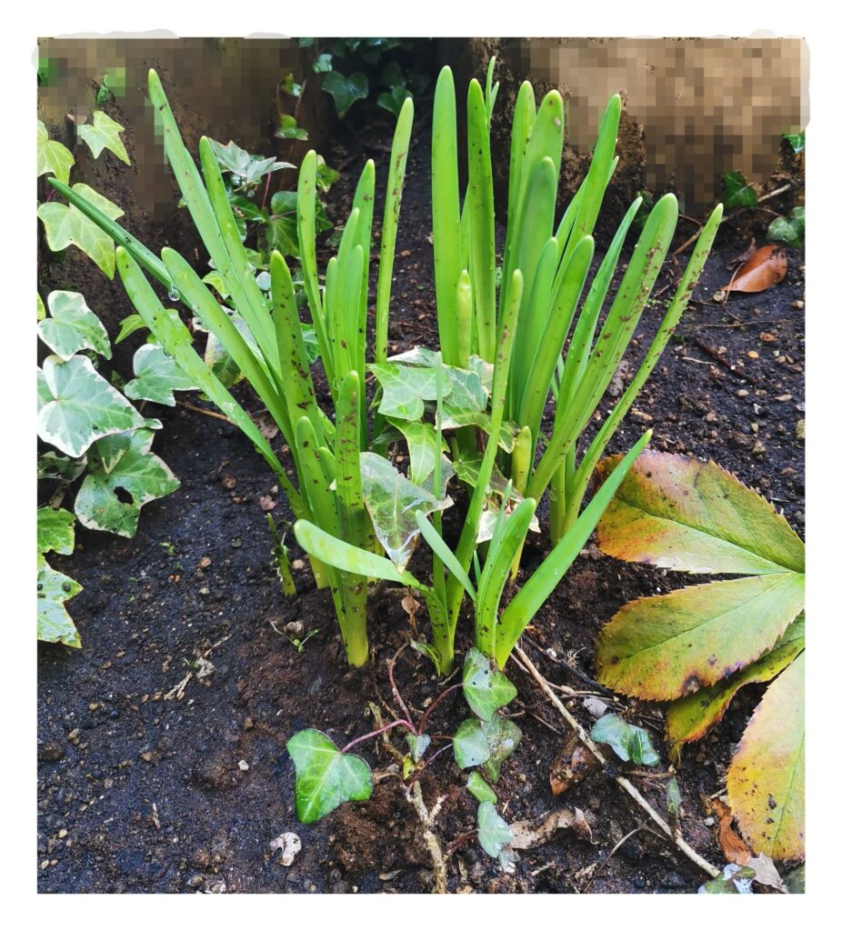 花壇のスイセンは、3日でこんなに大きくなりました。(3日前と今日の写真です)あと、何の花だったか?土から芽を出しています!
