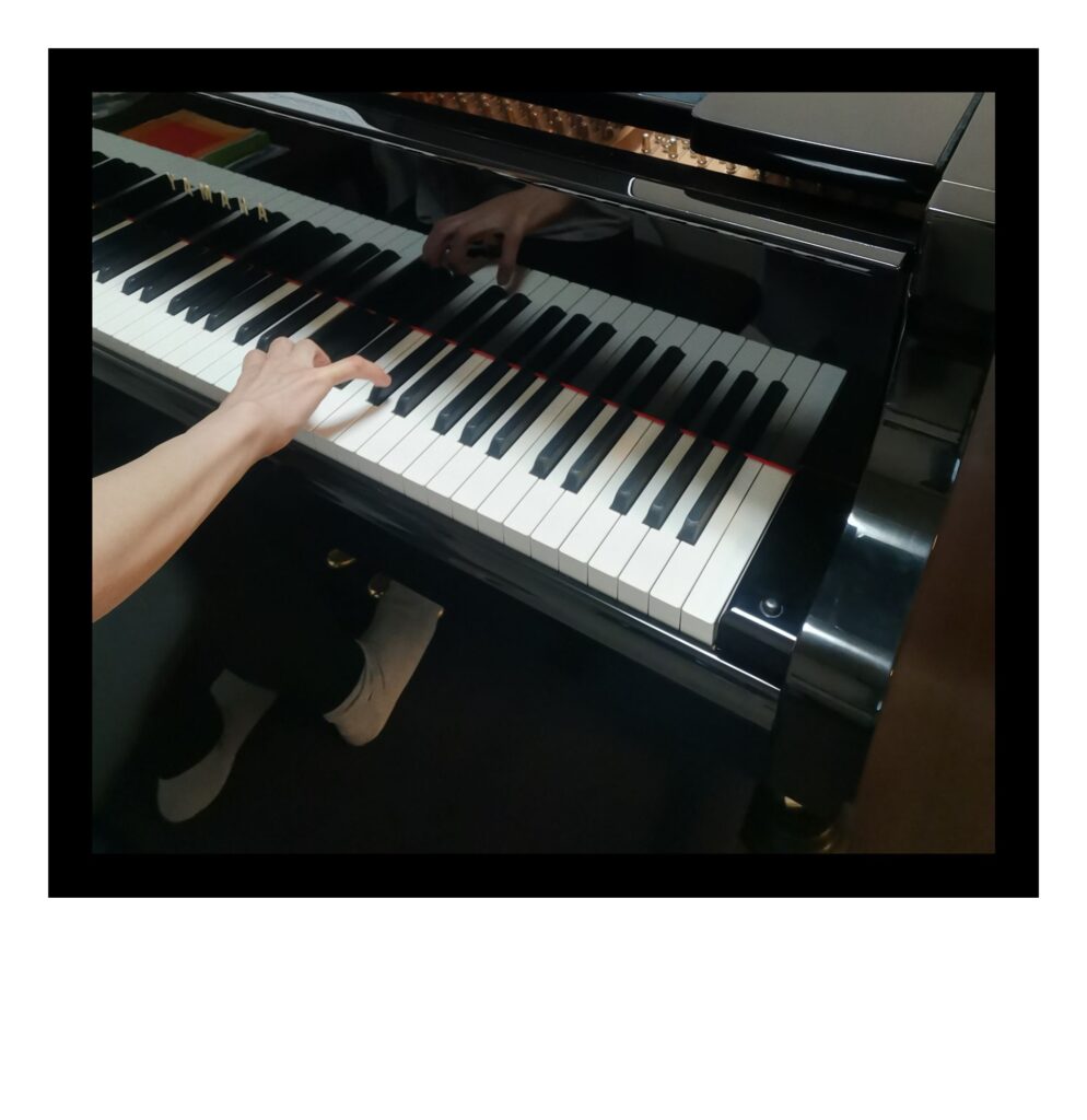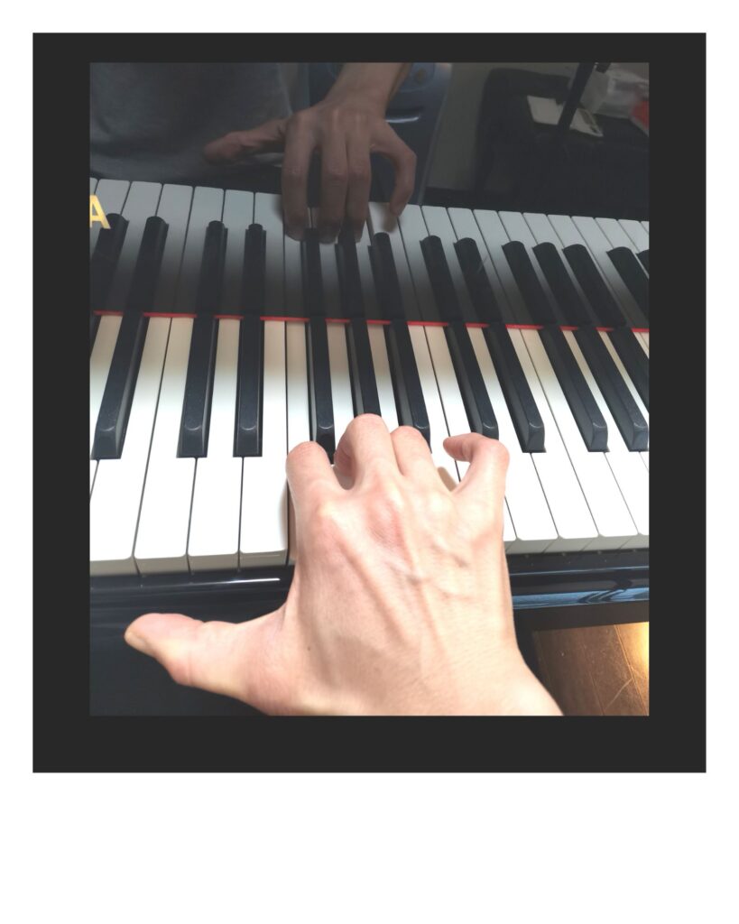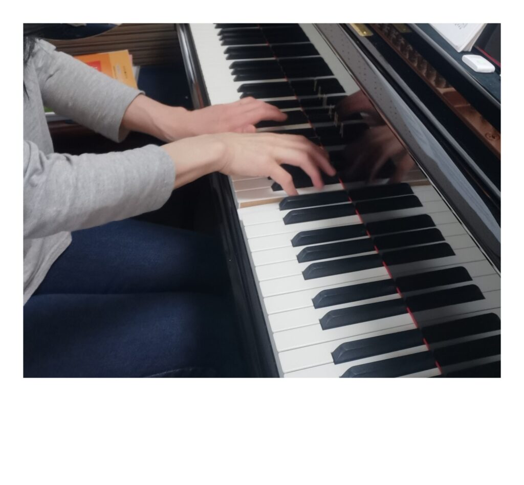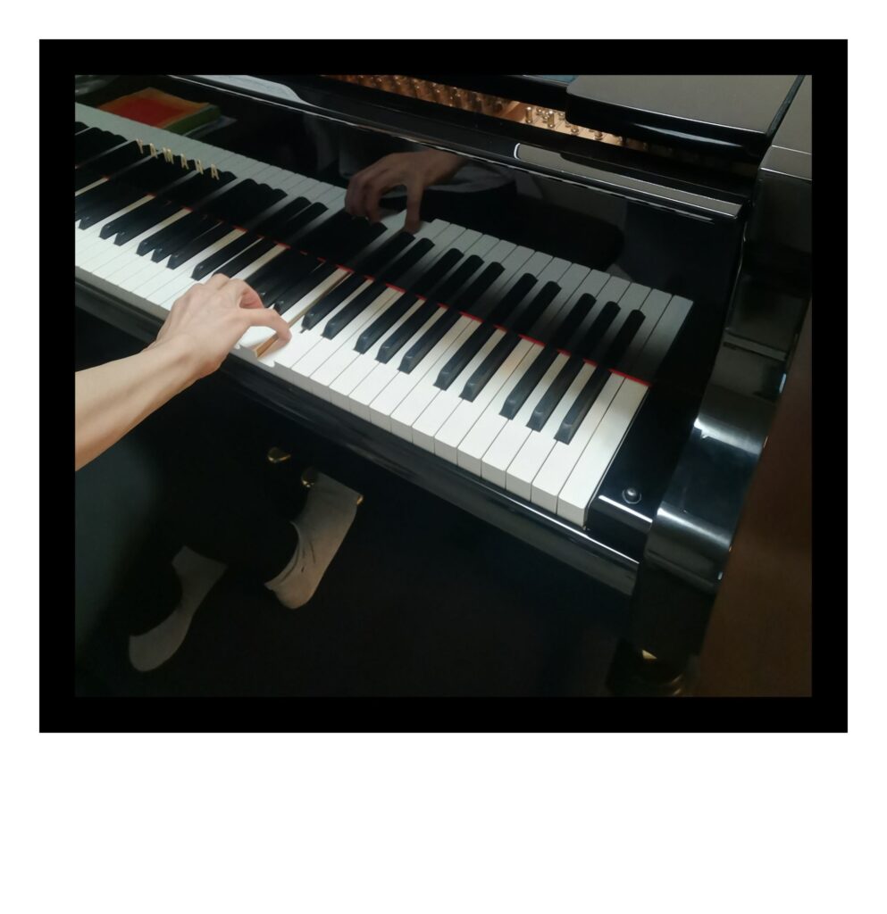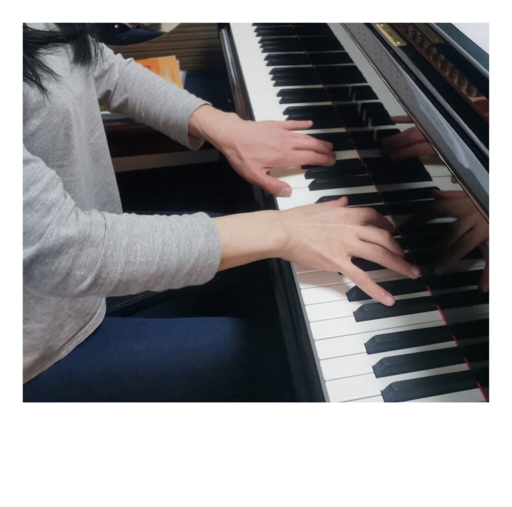 大人の写真は私ですが、毎日私がしているルーティーンを撮影してみました。かなり特殊なものもあります。指を開きながら伸ばして弾く奏法もありますし、左右どちらかが奥で弾くということは、ピアノの場合、日時茶飯事ですから、当教室では初歩の段階から鍵盤の奥で(ピアノの蓋の方)弾く事もしております。